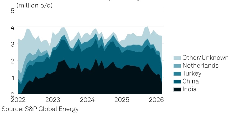 Однако удары украинских беспилотников негативно сказываются на экспорте нефтепродуктов. Источник: S&P Global. Структура российского морского экспорта нефти по направлениям. В марте ежемесячные морские поставки российской нефти достигли трехлетнего максимума благодаря ослаблению санкций США, однако экспорт незначительно снизился на фоне перебоев с погрузкой на основных балтийских хабах после непрекращающихся атак украинских беспилотников. Предварительные данные S&P Global показывают, что в прошлом месяце странам-импортерам было поставлено 4,61 млн баррелей в сутки (б/с) российской нефти. Это больше, чем 4,38 млн б/с в феврале, и является самым высоким показателем с июня 2023 года (4,65 млн б/с), а также самым высоким показателем с момента начала ведения статистики S&P Global в 2016 году. Рост морских поставок — результат того, что ранее США разрешили нефти и нефтепродуктам из России, отгруженным танкерами до 5 марта, продаваться в Индии независимо от санкционного статуса судов, если они