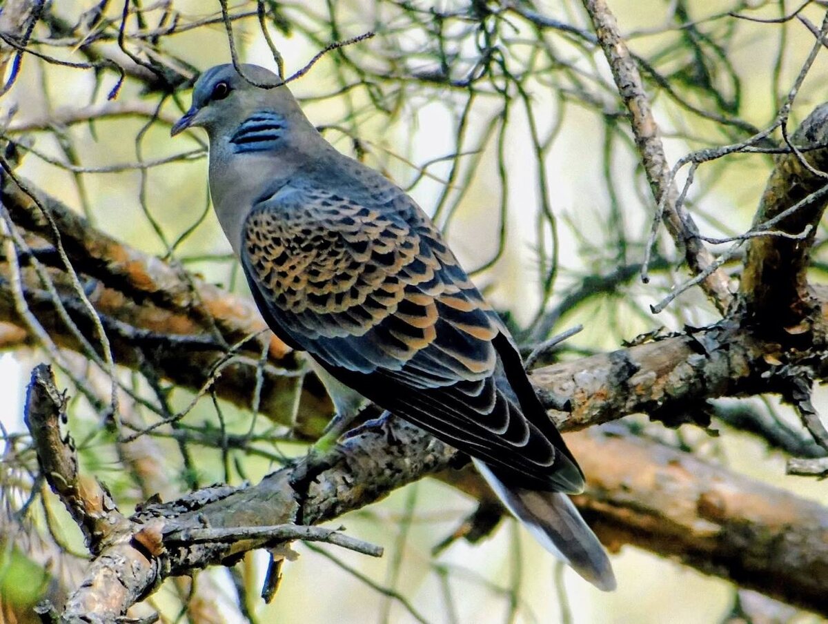 «В чешуе, как жар горя», отсвечивает в лесу большая горлица. Каждое её чёрное пёрышко на крыльях обрамляет широкая рыжая кайма. Эффектный узор смотрится как чешуя дракона. Заместитель начальника Минусинской лесопожарной станции Максим Дрюков поймал горлицу в кадр в тот самый момент, когда та спозировала всей своей «черепицей». Большая горлица – 30 сантиметров в длину, 300 граммов веса.Тело изящное и вытянутое, лапы красные. Оперение в приглушённых тонах: от бурого до нежно-голубого и розового. Шею по бокам украшает «ожерелье» из серо-сизых полосок. Зимуют в Юго-Восточной Азии. Возвращаются домой в апреле-мае рано утром, часто парами. Голос «большой» резко отличается от мягкого тембра других видов горлиц. В период ухаживаний грубое басовитое воркование самцов слышно за полтора километра. Некоторые слышат в этих «убу-убу… ту-бу-бу» глухое воющее рычание зверя. 🌳Небольшие постоянные гнёзда пары прячут в нижней части кроны деревьев. Строят их из хвороста и травы. Птенцы потом цементиру