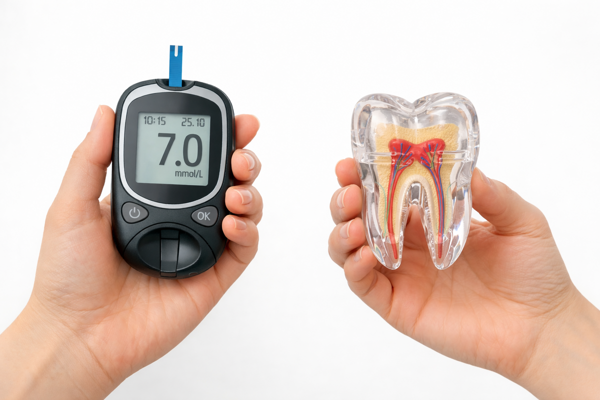 Сахарный диабет редко воспринимается как фактор риска для зубов. Но на практике именно полость рта часто становится одной из первых зон, где проявляются нарушения. Причина проста: диабет влияет на обменные процессы, кровоснабжение и иммунный ответ. А значит — на все механизмы, которые отвечают за защиту тканей полости рта. Поэтому пациенты с диабетом — это всегда группа повышенного риска. Изменения происходят не точечно, а системно. Эмаль становится менее устойчивой к кислотам, быстрее теряет минералы, хуже восстанавливается. Это повышает риск кариеса и делает зубы более уязвимыми к сколам и трещинам. При диабете процессы резорбции могут преобладать над образованием. Это касается в том числе кости, удерживающей зуб. В результате даже при внешне здоровых зубах может разрушаться их опора. Снижается слюноотделение, и полость рта теряет один из ключевых защитных факторов. Слюна не только очищает, но и регулирует pH, участвует в реминерализации. При её дефиците ткани становятся более уязвим