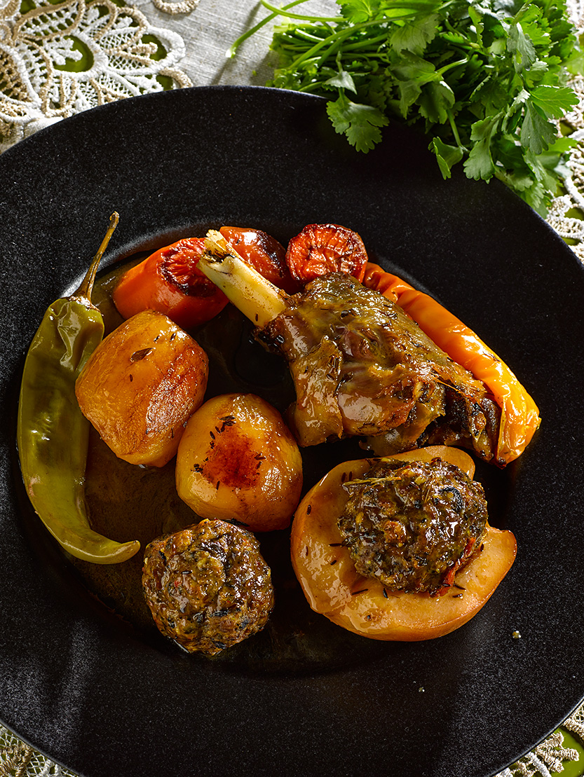 Когда уберете жир (надо торопиться, чтобы не остыли продукты!) - прибавьте нагрев, дайте закипеть соусу и полейте им все, что приготовили: айву, тефтели, кусок мяса и, конечно, картошку.
