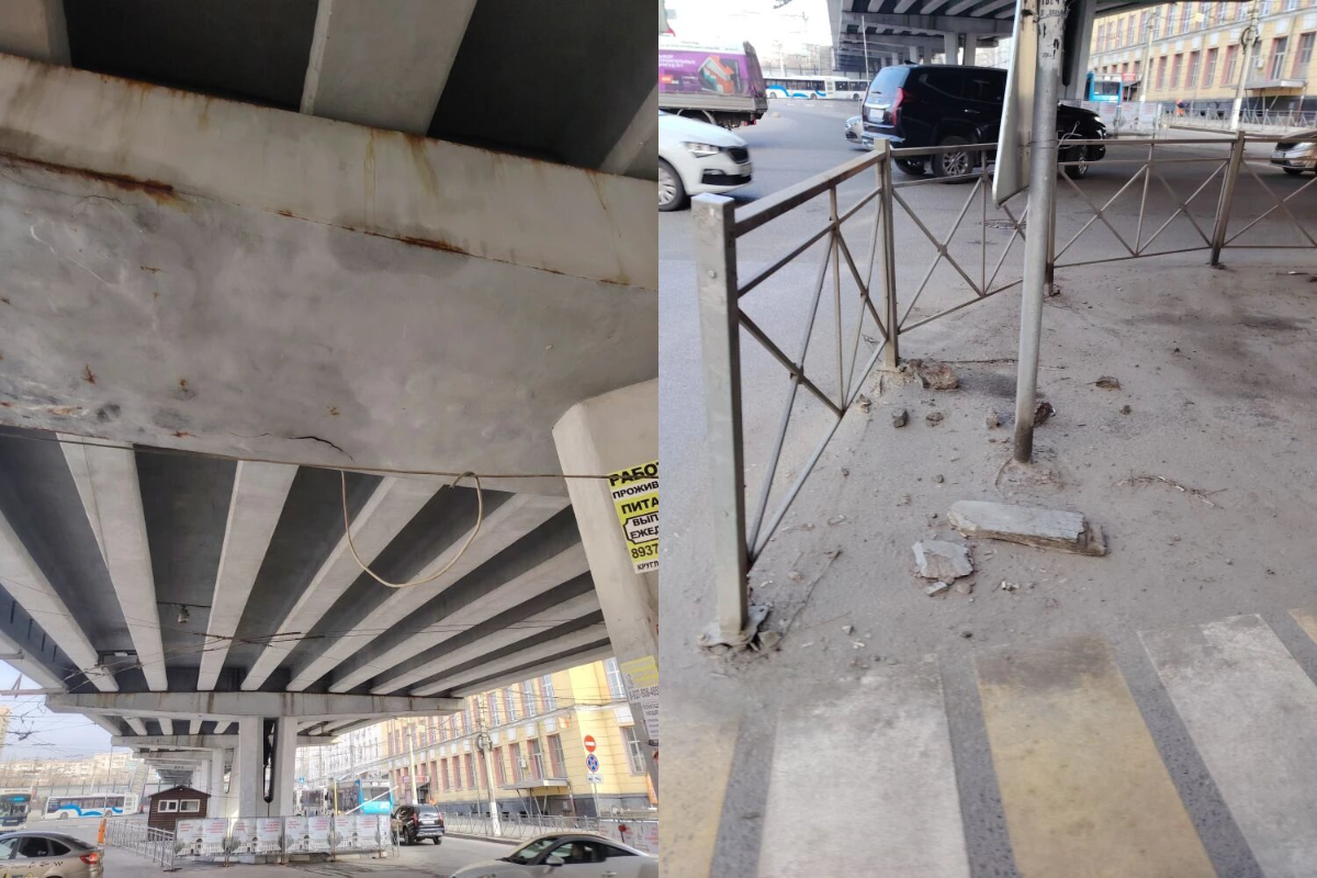 Мост обваливается кусками на проезжую часть, а перекрытия покрылись коррозией. Причиной такого состояния мэрия называет естественный износ материалов, воздействие агрессивных факторов, включая вибрацию от проходящих поездов и переувлажнение конструкций. Т