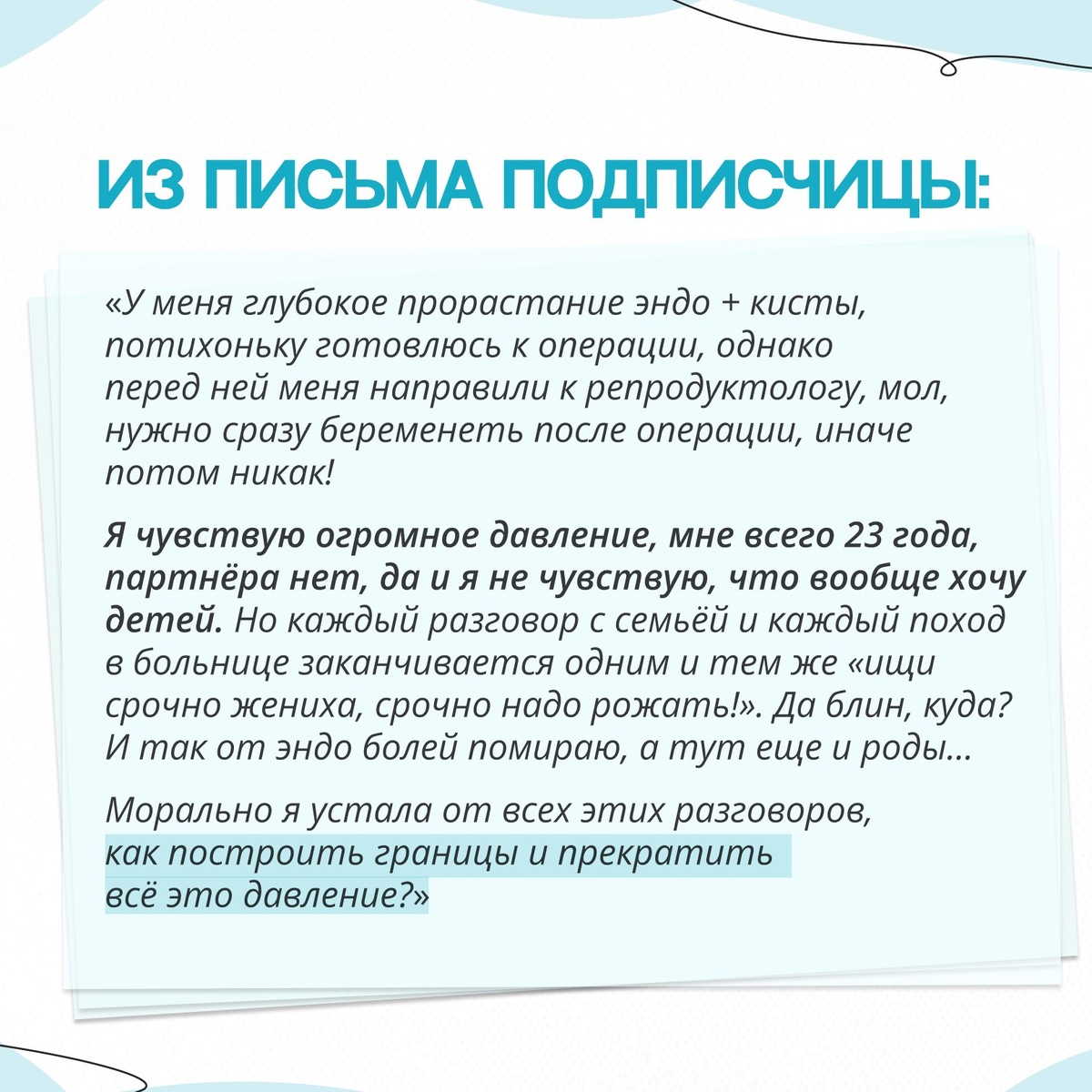 !»: отвечает Кузнецова Ольга Александровна, эксперт проекта: 💬 Репродуктивное давление при эндометриозе – это отдельный вид стресса. Диагноз автоматически помещает тебя в категорию «в зоне риска». Разговоры о детях становятся срочными, а срочность усиливает тревогу. С одной стороны – твоя реальная жизнь с планами, отношениями, карьерой. С другой – ощущение долга. Как будто ты обязана «успеть», «использовать шанс», «не упустить возможность». И тогда женщина уже не понимает: я правда хочу ребёнка сейчас или я боюсь, что потом не смогу? Как отличить своё желание от навязанного? ✅ Попробуй мысленно убрать всех. Родителей, партнёра, врачей, подруг, общество. Только ты и твоя жизнь через 5–10 лет. Что ты чувствуешь? Тепло? Интерес? Спокойствие? Или напряжение, спешку и чувство «надо успеть»? Представь, что медицинских рисков не существует, изменится ли твоё решение? Если ответ «да, тогда бы я не спешила», значит сейчас тобой руководит страх, а не готовность. Репродуктивные решения –