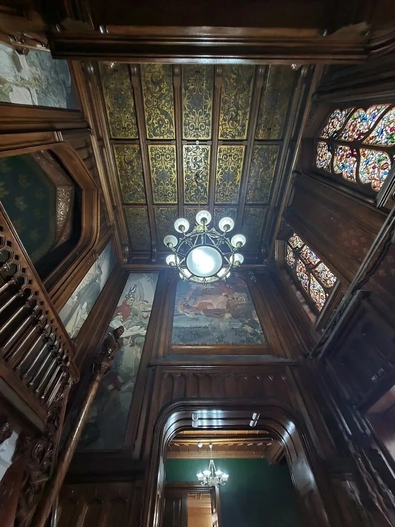 Колонны, мозаика, зеркало... Лестница мраморная широкая удобная, над ней кессонированый потолок. Красивый холл, голубая гостиная, музыкальная комната, амфиллада, русская и английская столовая, курительная комната. А кабинет в готическом стиле, это верх совершенства и резьбы по дереву. Живопись (панно Врубеля на тему Фауст) и витражи( не видны с улицы!) и скульптуры. 💘Романтичный будуар в стиле рококо, камин из цельного куска яшмы, гобелены(кстати старше самой усадьбы, Наполеоновского времени, привези лично из Парижа)и библиотека над ней.... Шкафы для книг сверху украшены крышами - домиками. Загадочный стол в центре для редких книг. Я под огромным впечатлением💯 Восхищает работа мастеров! Сейчас не все комнаты открыты, идёт реставрация. Был пристроен зимний сад, сейчас разрушен. Надеюсь потом смогу попасть на экскурсию ещё. Удивительная усадьба! Здесь будет киношкола Федора Бондарчука после ремонта. До скорых встреч 🤗