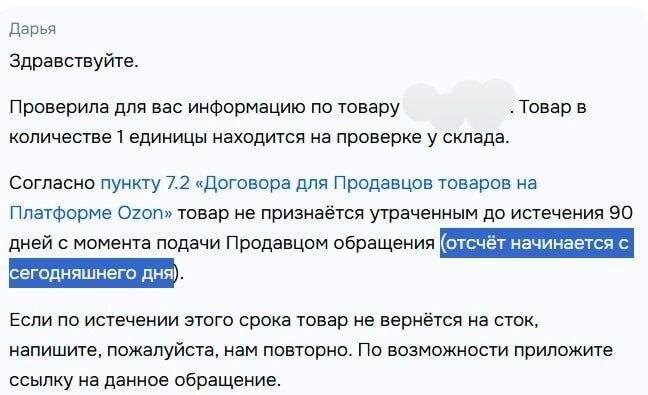 Интересный ответ поддержки. Товар не признаётся утраченным до истечения 90 дней с момента обращения продавца. И важная деталь: отсчёт начинается не с момента потери, а с момента, когда вы написали. Перевожу. Товар может где-то пропасть, лежать неизвестно где — но официально он “не утерян”, пока вы не зафиксировали это обращением. Не написали — отсчёт даже не начался. По факту ответственность смещается на селлера: не уследил, не написал вовремя — сроки просто сдвигаются. И вся история с компенсацией тоже. Если у вас плохо прогружаются файлы, все посты также доступны в MAX