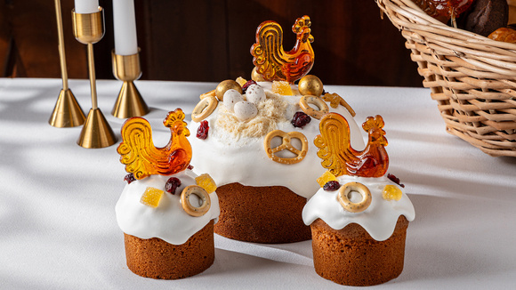 Шеф Алексей Локтионов к празднику представил авторскую линейку куличей: классическая база, но с кремовой начинкой внутри. Каждый кулич украшен глазурью и шоколадной корзинкой с маленькими разноцветными яйцами.