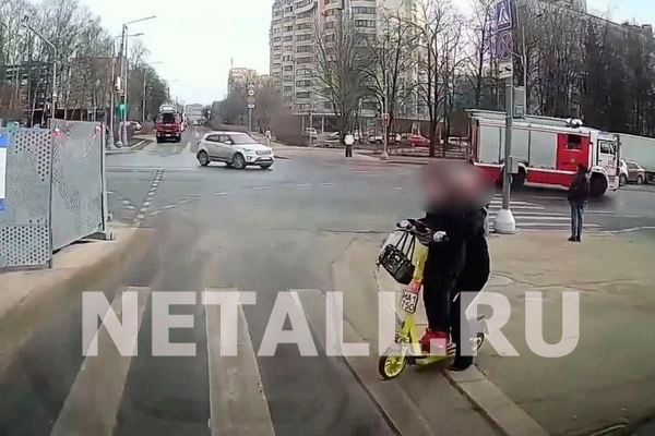 Двое подростков на одном самокате, двигаясь на красный свет, едва не оказались под колесами автомобиля на перекрестке у «Дома быта» в 4-м