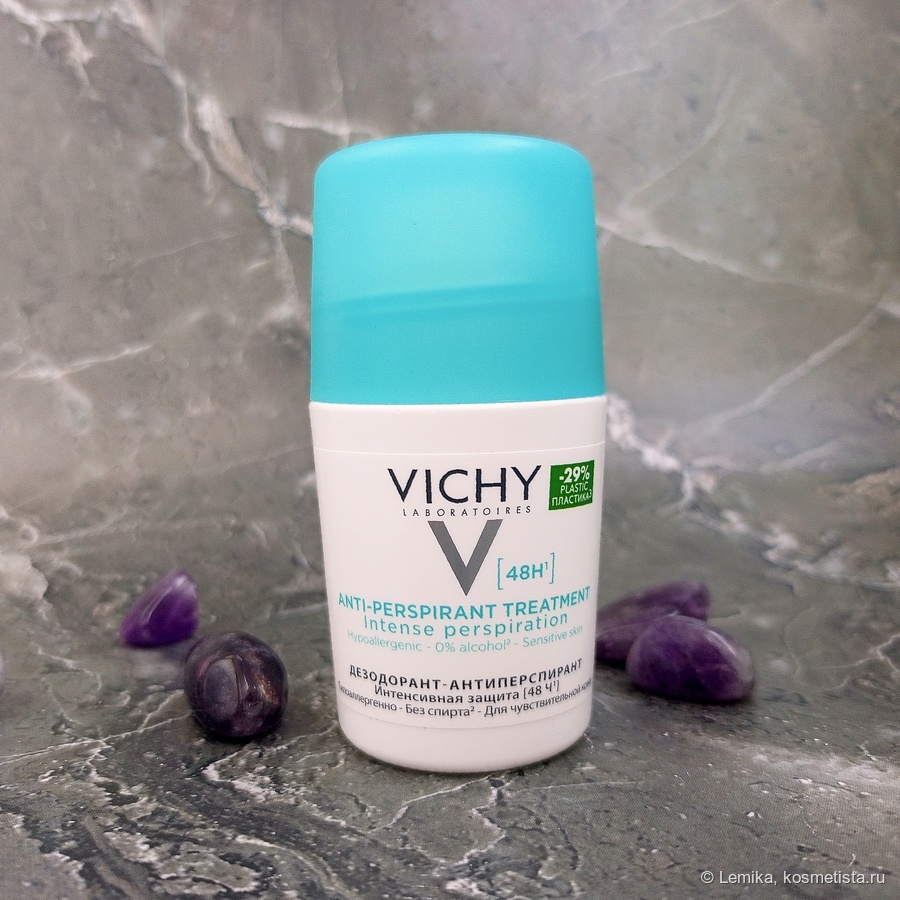 Скоро лето, а это значит, что в моей сумочке обязательно должен быть дезодорант. Хотя я пользуюсь отличным спреем — дезодорантомLa Roche-Posay Sensitive Skin 48H Deodorant, действия которого хватает на весь день, но летом я могу после работы на все выходные уехать на дачу или к подруге, и на следующий день дезодорант необходим. Для таких целей у меня есть шариковый дезодорант-антиперспирант Vichy Deodorants 48Hr Anti-Perspirant Treatment. Мне нравится, что он выпускается в компактной лёгкой упаковке, не течёт, а крышка надёжно закрывается. То есть места это средство займёт немного, и нет риска, что с флаконом что-то случится и средство испачкает сумку (как у меня однажды случилось с кремовым дезодорантом, тюбик которого случайно открылся). Мне нравится, как оформлен флакон. Крышка имеет приятный нежно-бирюзовый цвет. Она легко откручивается и надёжно закручивается. В руке его держать удобно, поверхность не скользкая. Страна производства: Франция Объём: 50 мл Срок годности после вскрыти