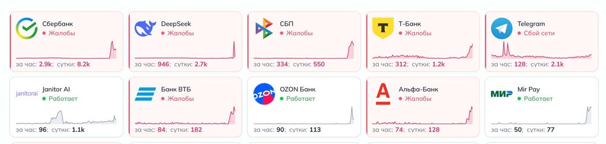Тотальный сбой затронул не только Сбер, но и другие банки в России Перебои возникли в мобильных приложениях ВТБ, Альфа-Банка и Т-Банка, а также в работе СБП. По данным Downdetector, проблемы фиксируют по всей стране. Читатели @inburg рассказывают, что в одном из торговых центров города покупатели ищут банкоматы для снятия налички. Кроме этого, не получается оплатить банковской картой на заправках «Лукойла». Обновлено в 18:15: В пресс-службе Альфа-Банка рассказали, что сбоя нет. Все работает как обычно.