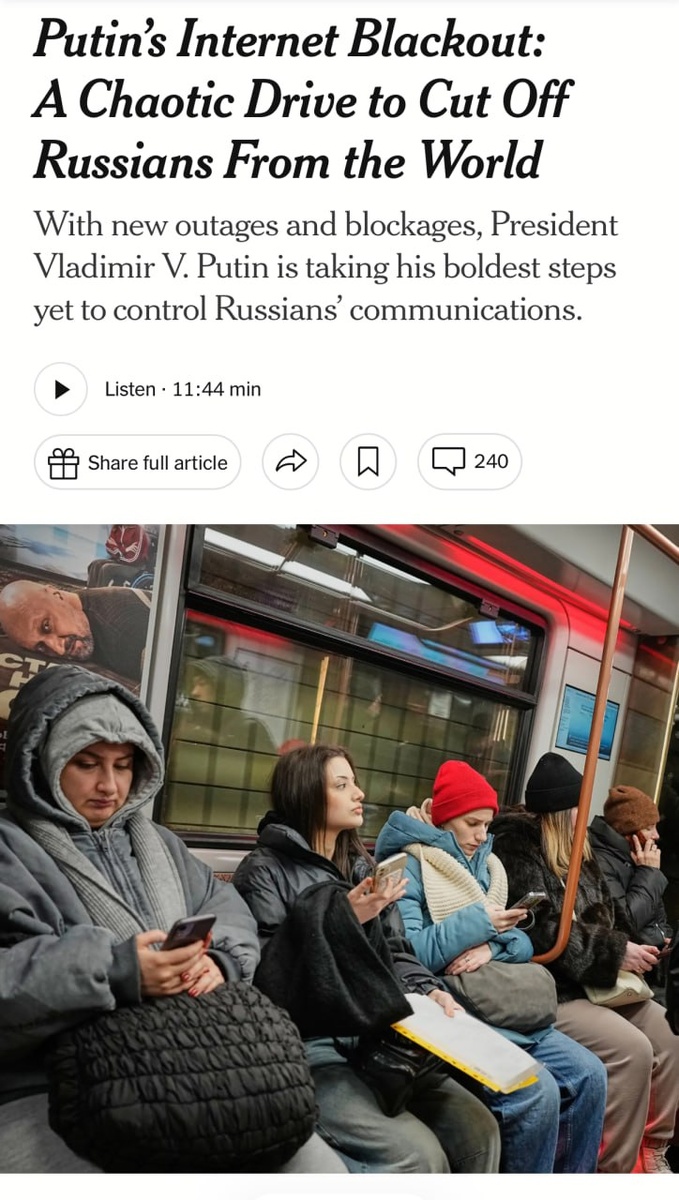 В тексте рассказывают, как репортёры не могут отправить материалы с места пожара напротив Госдумы, а у покупателей не получается расплатиться картами в магазинах. В материале нет буквально ничего нового для нашей аудитории. Он направлен на западную. То, что для россиян уже обыденность, для американцев — нонсенс. Речь о цензуре, VPN, роли Телеграма в жизни граждан и (плохом) отношении к MAXу. Но о санкциях и удалении VPN из российского App Store — ни строчки 😃