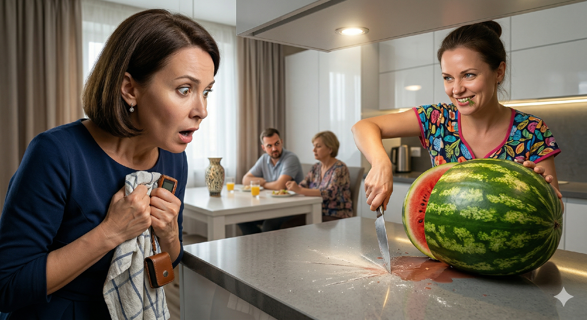 Я стояла в дверях собственной кухни и смотрела, как Оксана, моя золовка, уверенным движением вонзает нож в огромный арбуз. Прямо на столешнице. Без доски. Без капли сомнения в том, что она имеет на это право. Моя новая кухня, за которую я выплатила последний транш только в прошлом месяце, сияла девственно-белым акрилом и матовым глубоким серым камнем. Точнее, сияла до этой секунды.