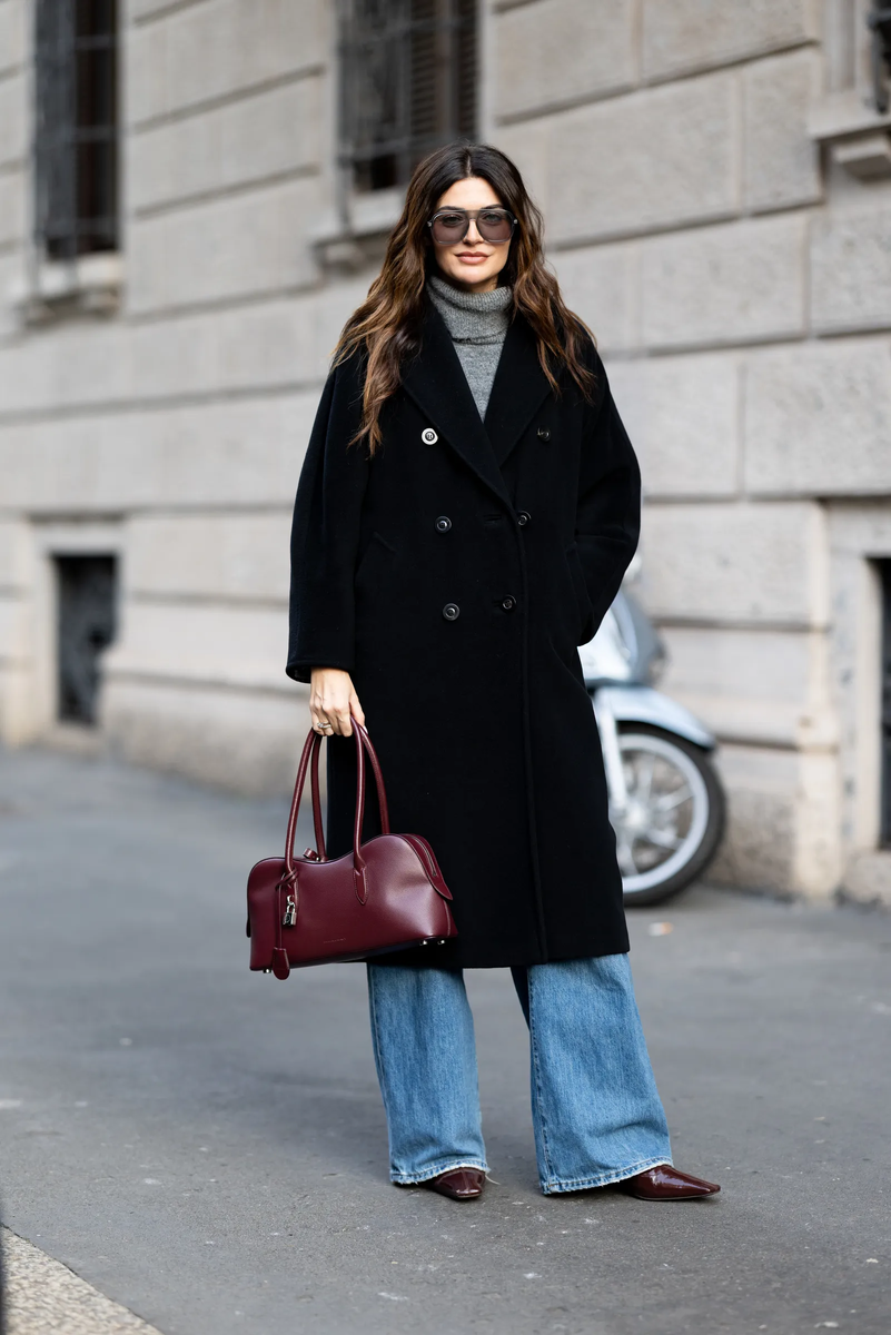 Черное пальто практически не оставляет места для ошибок, именно потому что это нестареющая классика, которая подходит ко всему. Составить образ с черным пальто очень просто. Длинный фасон идеально сочетается со всеми вещами длиной до щиколотки, такими как платья и юбки миди, а также со свободными джинсами. Сумка и обувь модного цвета украсят базовый образ.