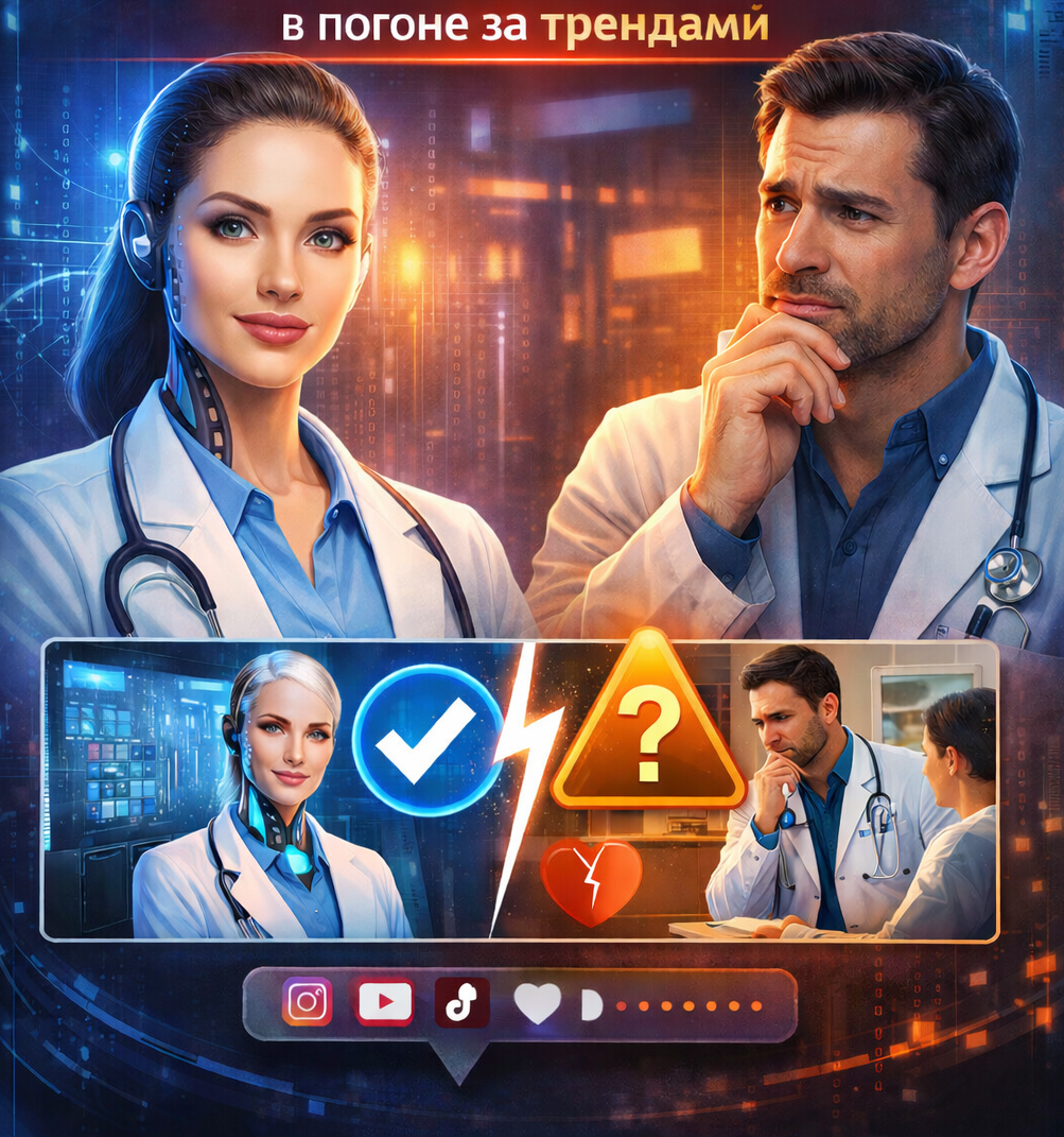 Если изображение может быть воспринято как фото врача, пациента, процедуры или результата, используйте только реальные кадры. Избегайте идеализированных картинок, которые намекают на гарантированный или «волшебный» результат. Медицина — это работа с индивидуальностью и рисками. Всё, что касается симптомов, противопоказаний, методов лечения, должно проверяться врачом. ИИ может помочь сформулировать, но не с ответственностью за содержание. Если вы используете нейроиллюстрацию, прямо указывайте, что это визуализация идеи, а не реальный клинический случай. Лицо врача, живая речь, разбор случаев (в этичных границах), атмосфера клиники — это основа доверия. ИИ может быть только помощником, но не заменой. 3-4 уместных нейроэлемента в месяц достаточно. Если ИИ начинает заполнять большую часть контента — это повод пересмотреть стратегию: скорее всего, из коммуникации уходит живая профессиональная ткань.