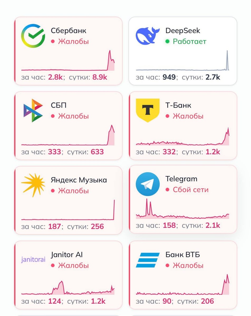 Проблемы начались со Сбербанка, после чего сбои появились у Т-Банка, ВТБ и в системе быстрых платежей. Оплатить покупки сейчас невозможно: терминалы выдают ошибки при попытке расчёта картой, по QR-коду или через Bluetooth. Также не проходят банковские переводы. Платежи не принимаются в магазинах, заведениях быстрого питания, аптеках, метро и на маркетплейсах. Помимо этого, не работают банкоматы, а у многих пользователей возникают трудности с входом в банковские приложения. detector404.ru/