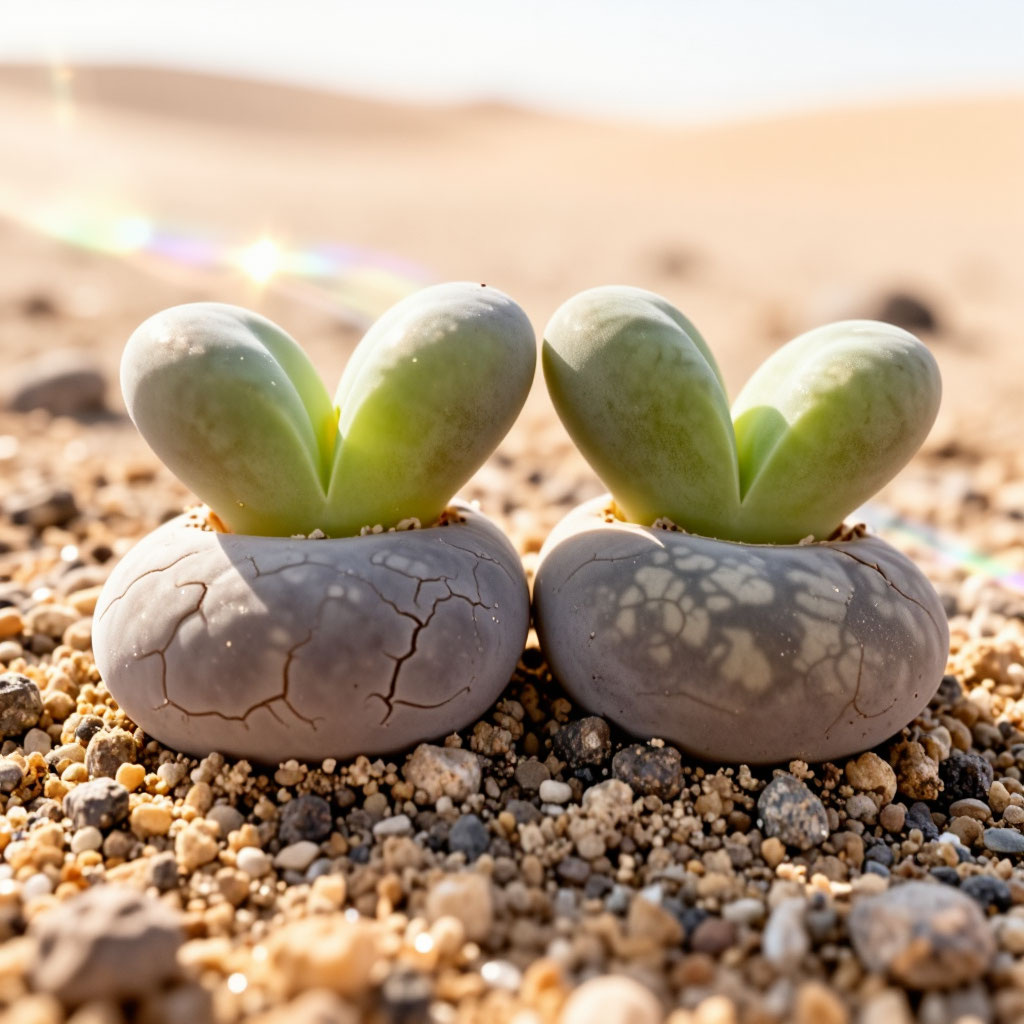 Эти суккуленты из пустынь Южной Африки настолько похожи на гальку, что их трудно заметить даже специалисту. Два мясистых листа с плоской поверхностью и рисунком, напоминающим трещины и пятна, позволяют растению сливаться с окружающей средой. Такая маскировка спасает от травоядных животных.
