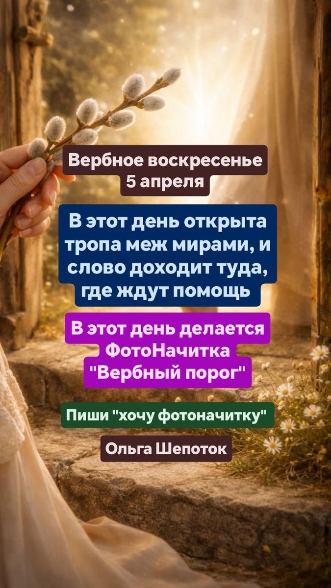 ) "Вербный порог". Фотоначитка на Вербное Воскресенье. 5 апреля — день, когда Небо ближе, чем кажется, день, когда верба слышит. В этот день открыта тропа меж мирами, и слово доходит туда, где ждут помощь. Так раньше бабки начитывали на воду, хлеб, да на образ. Теперь — на фотографию. Это не просто снимок. Это живая ниточка к человеку. В этот день я читаю особые шепотки над вашими фотографиями — чтобы направить силу туда, где она особенно нужна. Обозначаете нужную тему. Присылаете фото — я делаю настройку через шёпотки и практики. 🔹 Возможные темы начитки: 1️⃣ Очищение от тяжести и боли 2️⃣ Пробуждение силы и пути 3️⃣ Защита и благословение 4️⃣ Чтобы здоровье держалось 5️⃣ Мир и лад в семье 6️⃣ Чтобы любовь пришла 7️⃣ Чтобы жизнь наладилась 8️⃣ (Ваша тема): Дайте мне знать, какую тему вы бы хотели добавить, и я проведу соответствующую начитку 🌱 🪻 🌱 🪻 🌱 🪻 🌱 Благодарственный донат за начитку на одну тему с фотографией 399 ₽ Запрос на начитку делаем по моей ссы