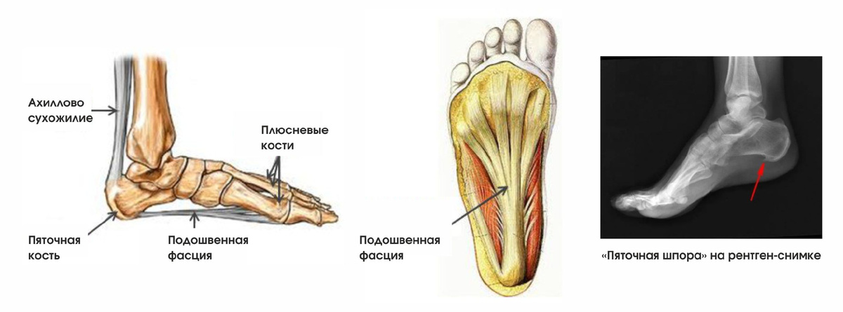 Когда фасция воспаляется и утолщается, возникает боль. А костный вырост (шпора) на пятке — это не причина, а следствие длительного воспаления. Шпора появляется там, где фасция тянет надкостницу, и организм «укрепляет» это место кальцием.