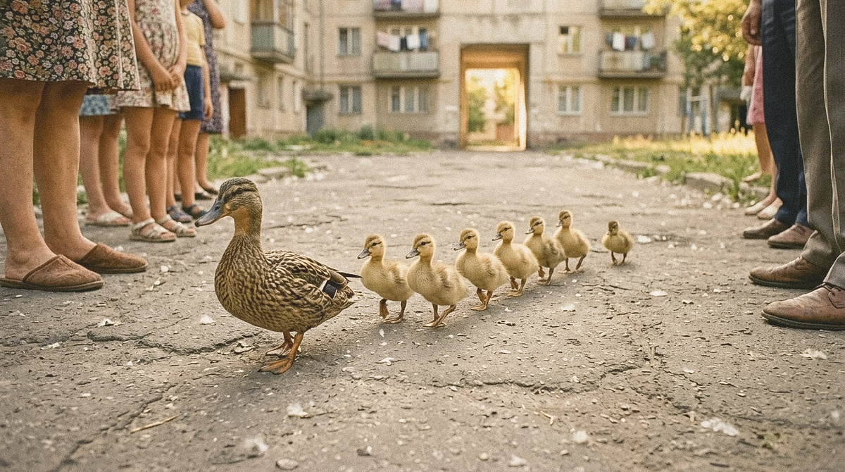 Зоя замерла на лавочке. Забыла, что жарко. Забыла, что газета под ней шуршит. Смотрела, как утка поворачивает к центру двора, не меняя шага, а утята бегут за ней, не отставая. Только маленький - чуть подотстал, но держался.