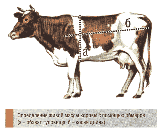 Нужно сделать несколько замеров: Обхват груди — рулетку оборачивают вокруг груди животного сразу за лопатками, лента должна плотно прилегать, но не сдавливать животное. Длина тела — для измерения расстояния от лопаток до основания хвоста животное должно стоять прямо, с опущенной головой. Важно помнить: Для достижения точных результатов измерений важно, чтобы животное находилось в спокойном состоянии во время процедуры. Чтобы повысить точность определения веса, рекомендуется выполнить несколько замеров и затем рассчитать среднее арифметическое значение всех полученных данных. Затем полученные значения используются для расчёта веса с применением корректирующего коэффициента: Если корова относится к молочной породе, используют коэффициент 2. Для мясных и мясо-молочных пород применяют коэффициент 2,5. Пример: живая масса коровы при её длине 200 см и обхвате за лопатками 180 см будет равна 200×180×2×0,01 = 720 кг. Результаты расчёта дополнительно корректируют по упитанности: если корова худ