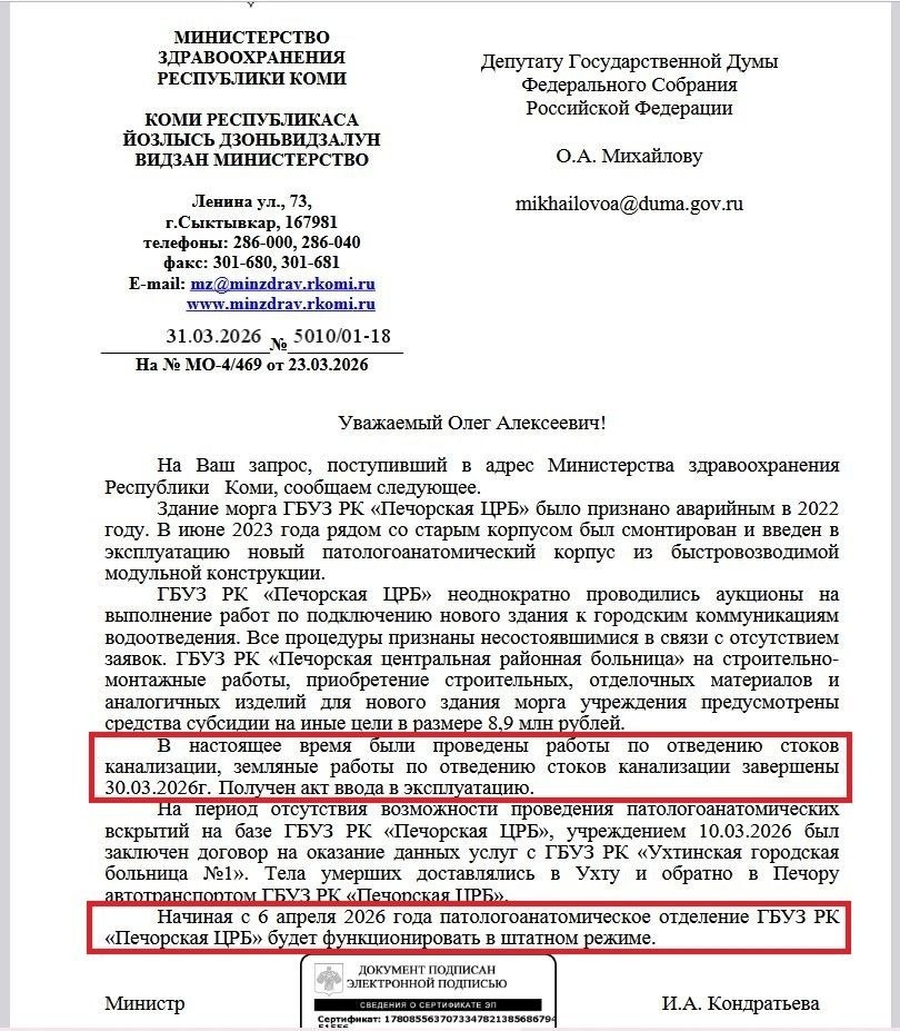 А ЕСЛИ СЛУЧИТСЯ НОВОЕ ЧП? После обрушения старого морга в Печоре депутат Госдумы от КПРФ Олег Михайлов направил запрос в Минздрав Коми. В ответе — обнадёживающие слова: с 6 апреля отделение заработает «в штатном режиме». Земляные работы по канализации завершены, получен акт ввода. Но коммунисты Печоры выяснили, что радоваться рано. Подключение к сетям водоотведения — временное. Глубина труб — всего метр. Зимой промёрзнут — и морг снова встанет. Договора на водоснабжение нет — используется нелегальная скважина без лицензии. Санитарно-эпидемиологического заключения Роспотребнадзора тоже нет. На каком основании собираются работать? Но самое страшное даже не это. Сейчас ледоход на Печоре вот-вот начнётся. Переправ уже нет. Дорога отрезана. Если в новом «подключённом» морге случится ЧП — прорвёт та же канализация или его снова закроют, — куда везти людей? В Ухту? Не получится. Автомобилем не проехать. Остаётся поезд. Но в РЖД, как выяснилось, нет вагонов, приспособленных для перевозки т