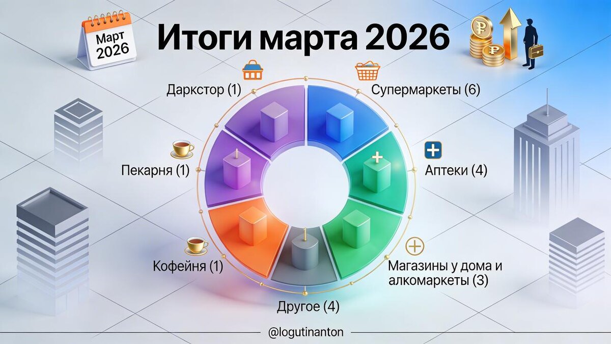 В марте 2026 года рынок готового арендного бизнеса (ГАБ) снова показал стабильный интерес инвесторов к проверенным форматам. Вот как распределились сделки по категориям: 1. Супермаркеты — абсолютный лидер месяца (6 сделок). Стабильный спрос на продукты питания и привычка к офлайн-покупкам делают этот сегмент самым надёжным для инвесторов. 2. Аптеки — 4 сделки. Медицинские услуги и товары первой необходимости остаются вне конкуренции даже в условиях экономической неопределённости. 3. Другое — 4 сделки. В эту категорию попали разноплановые объекты, что говорит о поиске новых ниш и гибкости инвесторов. 4. Магазины у дома и Алкомаркеты — 3 сделки. Компактные форматы с высокой оборачиваемостью продолжают привлекать внимание. 5. Кофейни, пекарни, дарксторы — по одной сделке. Эти сегменты пока менее популярны, но интерес к ним сохраняется, особенно в крупных городах. Выводы: Супермаркеты и аптеки — самые востребованные и безопасные инвестиции в сегменте ГАБ. Компактные форматы (магази