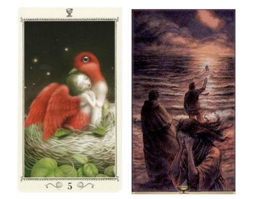 ИЗУЧАЕМ ТАРО НИКОЛЕТТЫ ЧЕККОЛИ «То, на что ты рассчитывала, никогда не случится» - так сказано по поводу этой карты в МБК. Поэтому так и прильнули друг к другу девочка и хозяин гнезда – человек с птичьей головой. Им не быть вместе. Никогда! Какая трогательная и грустная картина. Кто-то уходит, а кто-то остается. Так часто бывает. И если в предстоящем путешествии тебя пугает неизвестность, то представь, как тяжело тому, кто остается – ведь он будет не только переживать о тебе, но и терзаться муками одиночества. Если перед тобой открывается, пусть неизвестная, но перспектива, то тому, кто болеет за тебя, нЕчего рассчитывать на перемены, о его жизни почти все уже известно. Трудно уходить, больно и страшно. Но тому, кто остается – всегда хуже и тяжелее. И посмотрите, какие они разные – девочка с крыльями и птица с человеческим телом. А может, это птица отдала ей свои крылья, чтобы любимая могла улететь? Может быть ситуация складывается именно так, что выжить должен кто-то один? Кто скрывае
