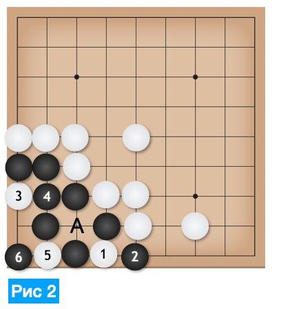 Решение задачи Форма черных выглядит неприступной: есть глаз «А», туда сейчас ставить белый запрещено; черные камни сильные, очевидных слабостей нет. Нужно понять, в чем заключается адзи. Ходы белых на рис. 2 – это бессмысленная атака черных в лоб. На любой удар, черные отвечают либо захватом белых, либо становятся еще сильнее. Ход 1 на рис. 3 использует адзи черной группы (разрыв) и угрожает ударом в «А». Если черные пропустят такой удар, то два черных камня попадают в защелку. Поэтому черные обязаны защищаться, соединяя свои камни ходом в «А». На рис. 4 показано, как работает защелка, если черные проигнорировали угрозу. Хорошо, белые заставили черных среагировать и укрепиться ходом 2 (рис. 5). Дальше белые исчерпали возможности внутри черной группы и переключаются на работу снаружи. Камень 3 активирует другое адзи черных. Четыре черных камня, которые построили глаз, конечно, сильные. Но их форма не монолитна. Это пример плохого адзи, которое черные оставили на потом. Если черн