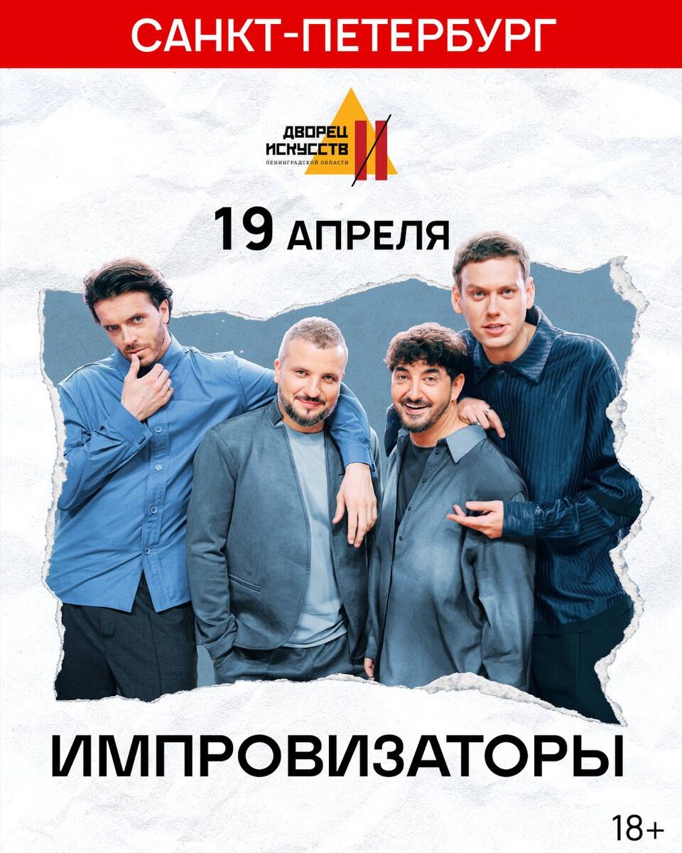 ! Арсений Попов, Дмитрий Позов, Сергей Матвиенко и Антон Шастун выступят с двумя концертами - в 15:00 и 19:00 Шоу, где вы не просто зрители: ваше настроение, идеи и энергия помогают создавать шоу здесь и сейчас! 📌Билеты на comedyconcert.ru Дорогие зрители! Концерт 19 апреля состоится (без переноса и отмены). Это мероприятие не входит в большой тур "Импровизаторы 10 лет". Как понять, что концерт относится к туру в честь 10-летия: 1. Название концерта - «Импровизаторы. 10 лет» 2. Черно-белая афиша 3. На сайте comedyconcert.ru во вкладке проекты есть отдельная станица со всеми городами тура, которая также называется «Импровизаторы. 10 лет». Все концерты тура по ссылке Адрес: Дворец искусств ЛО, Площадь Стачек, 4 🥰 Telegram | MAX | VK