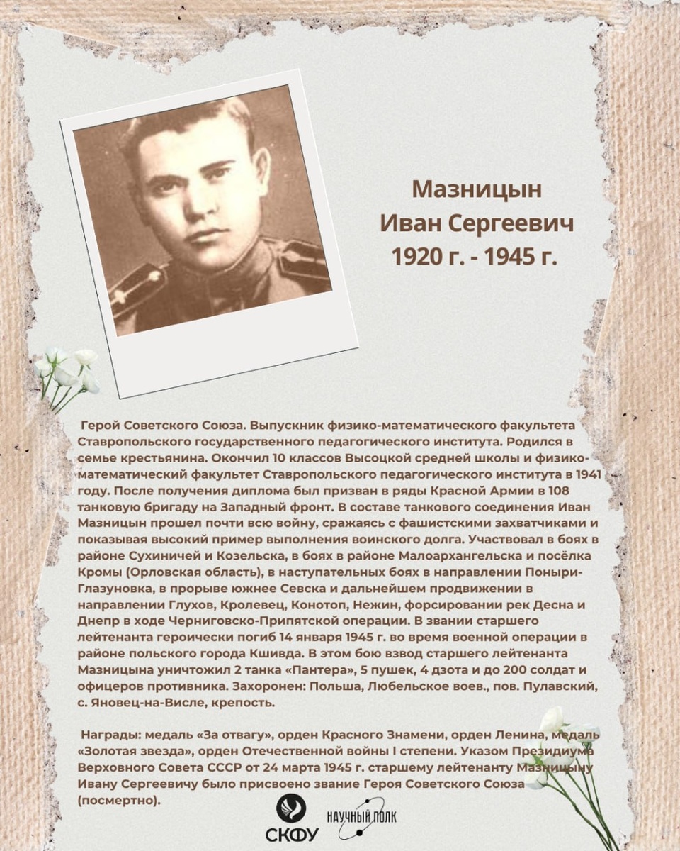 В Северо-Кавказском федеральном университете стартовала ежегодная акция в рамках федерального патриотического проекта «Научный полк» Минобрнауки России. Научный полк СКФУ - это те люди, чей труд и достижения в военные годы изменили мир навсегда. Цель проекта – сохранить историческую память о высшей школе и отечественной науке в военные и послевоенные годы. Наука - это ключ к пониманию мира и к его улучшению. И сегодня мы хотим поделиться историей одного из великих людей СКФУ. #СКФУ #ЛицаПобеды #НаучныйПолк 👻 MAX | 💙ВК | 📝ДЗЕН