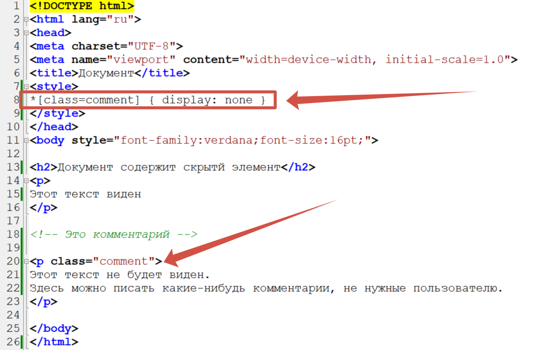 Ну вообще для решения этого вопроса в HTML есть комментарии: <!-- Это комментарий --> Однако, если вам очень сильно захочется использовать CSS для сокрытия какого-то блока, то и это возможно. Например, так: *[class=comment] { display: none } И теперь любой HTML-элемент, который имеет класс comment, не будет отображаться браузером. Вот пример кода: На этом всё. Подписывайтесь на канал, чтобы ничего не пропустить.