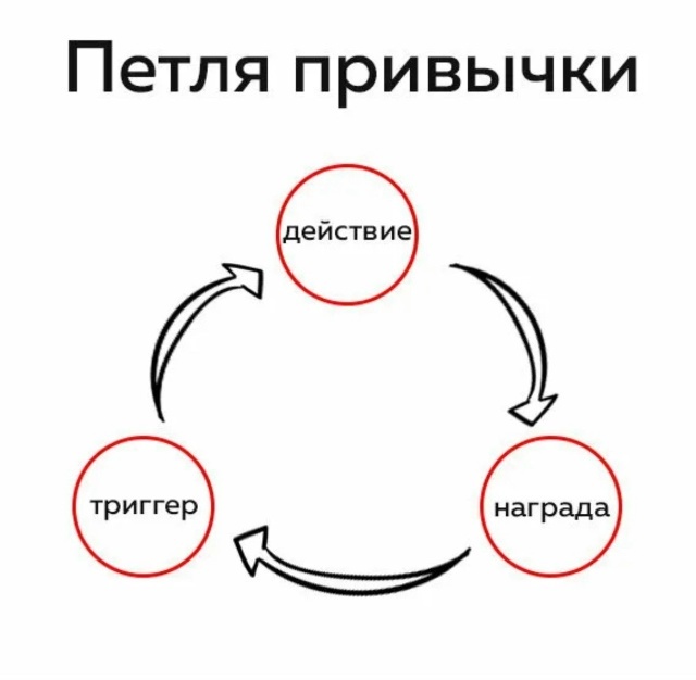Без понимания механики любые советы по самодисциплине зачастую просто насилие над собой. Потому что привычка, в большей степени, это не про волю, а про физиологию. Наш мозг очень ленивый, самый настоящий патологический лентяй. Он потребляет 20% всей энергии тела, и его главная задача - экономить её. Самый простой способ экономить энергию, например, переводить действия на автопилот. Важно понимать, что за осознанные решения в нашем мозге отвечает префронтальная кора. Она умная, но быстро устает. Но, как только ресурс на исходе (вечер, стресс, усталость), управление перехватывает древняя часть мозга, где живут автоматизмы. 4 шага вашего автопилота или петля привычки: Любая привычка движется по одной и той же петле. Любая - от привычки пить воду по утрам до привычки залипать в телефоне при тревоге. 1. Стимул-Триггер Сигнал, который запускает процесс. Например, Вы зашли в темную комнату - Вам нужно включить свет. Или Вы почувствовали скуку, и рука сама тянется к телефону. 2. Желание-Тяга Э