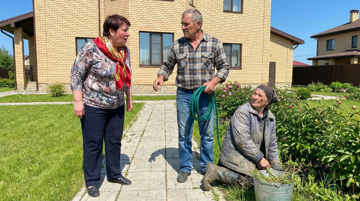 Та совершенно спокойно взяла тяжелое ведро с сорняками и отвернулась к клумбе.