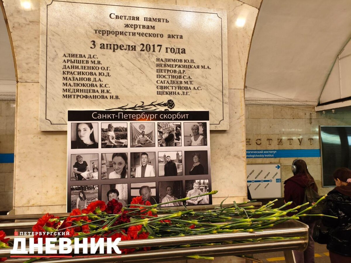 Сегодня, 3 апреля, Петербург вспоминает жертв теракта в метрополитене, который произошел в 2017 году. Трагедия унесла жизни 15 человек, более 100 пострадали. Мемориал на станции метро «Технологический институт» запечатлел фотограф «Петербургского дневника». Напомним, мемориальная доска была установлена в вестибюле станции в 2020 году – сегодня петербуржцы возлагают к ней цветы. Также в Троицком соборе будет отслужена панихида по погибшим. Ранее «Петербургский дневник» сообщал, что по инициативе пострадавших, родных погибших и неравнодушных граждан создана Национальная ассоциация оказания помощи пострадавшим от террористических актов и чрезвычайных ситуаций «Надо жить». Посмотреть фильм «Тот день» можно здесь.