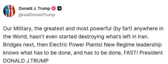 «Մեր զինված ուժերը, որոնք ամենամեծն ու հզորն են ողջ աշխարհում, դեռ չեն էլ սկսել ոչնչացնել այն, ինչ մնացել է Իրանում։ Հաջորդը հերթում կամուրջներն են, իսկ հետո՝ էլեկտրակայանները։ Նոր վարչակարգի ղեկավարությունը գիտի, թե ինչ է պետք անել, և դա պետք է արվի արագ»,- գրել է նա։