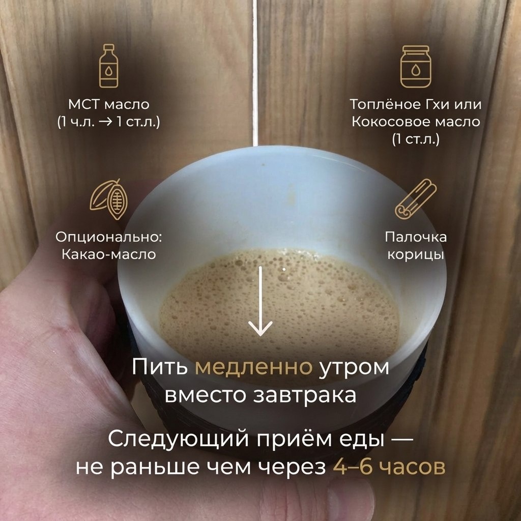 Работает? Я решил попробовать «бронекофе» — не ради хайпа, а чтобы понять, правда ли он помогает продержаться до обеда без еды и ускорить кетоз. 🔬 Что это вообще такое? Бронекофе — это кофе + жиры (масло Гхи, кокосовое, MCT или обычное сливочное) и больше ничего, никакой еды или добавок. Такой завтрак не поднимает сахар и инсулин, поэтому организм быстрее переключается на сжигание собственного жира. Классику пьют на кето‑диете, но можно и просто для контроля аппетита. ⏱️ Через сколько наступает кетоз? На строгом кето (20–50 г углеводов в день) — через 48–72 часа. Если добавить бронекофе натощак + физическую нагрузку — можно войти за 24–48 часов. Полная адаптация (без «кето‑гриппа» - гриппозное состояние, но без болезни) — 1–2 недели. 🧈 Мой упрощённый эксперимент У меня не было специальных масел MCT или Гхи. Поэтому я сделал так: Сварил эспрессо (можно и просто любой кофе, даже фильтр). Добавил столовую ложку обычного сливочного масла 82,5%. Залил горячей водой (примерно 150 м