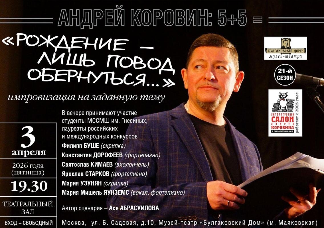 Андрея Коровина. Сегодня у Андрея Юрьевича юбилей, поздравляем и выражаем огромную благодарность за труд от всего коллектива «Булгаковского дома»! Литературный салон регулярно работает с 2005 года. За это время на вечерах побывали такие литераторы: Андрей Битов, Валерий Прокошин (Обнинск), Равиль Бухараев (Лондон), Андрей Грицман (Нью-Йорк), Евгений Евтушенко, Бахыт Кенжеев (Монреаль), Евгений Клюев (Копенгаген), Наум Коржавин (Бостон), Юрий Кублановский, Анатолий Найман, Владислав Отрошенко, Евгений Рейн, Олег Хлебников, Алексей Цветков (Нью-Йорк) и многие другие. Желаем Андрею Юрьевичу крепкого здоровья, неиссякаемого потока идей, большой энергии и сил продолжать творить. Свой день рождения Андрей Коровин празднует в стенах «Булгаковского дома» и по традиции устраивает литературный салон. Тема вечера: «Рождение – лишь повод обернуться». В вечере принимают участие студенты МССМШ им. Гнесиных, лауреаты российских и международных конкурсов Вход свободный. Начало в 19:30