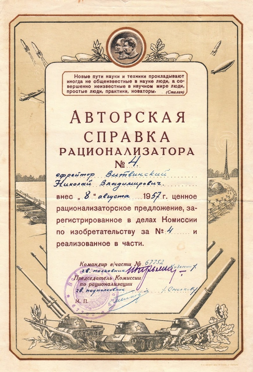 Авторская справка рационализатора выданная ефрейтору Витвинскому Николаю Владимировичу, в том, что он внес 8 августа 1957 года ценное