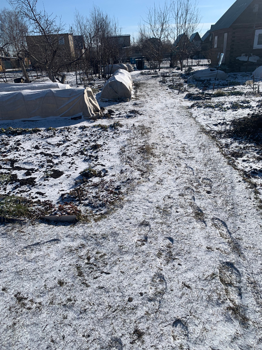 Утром приехала в сад, а там всё снег укрыл. Для молодых растений это даже полезно: снег их укрывает и защищает от холода.