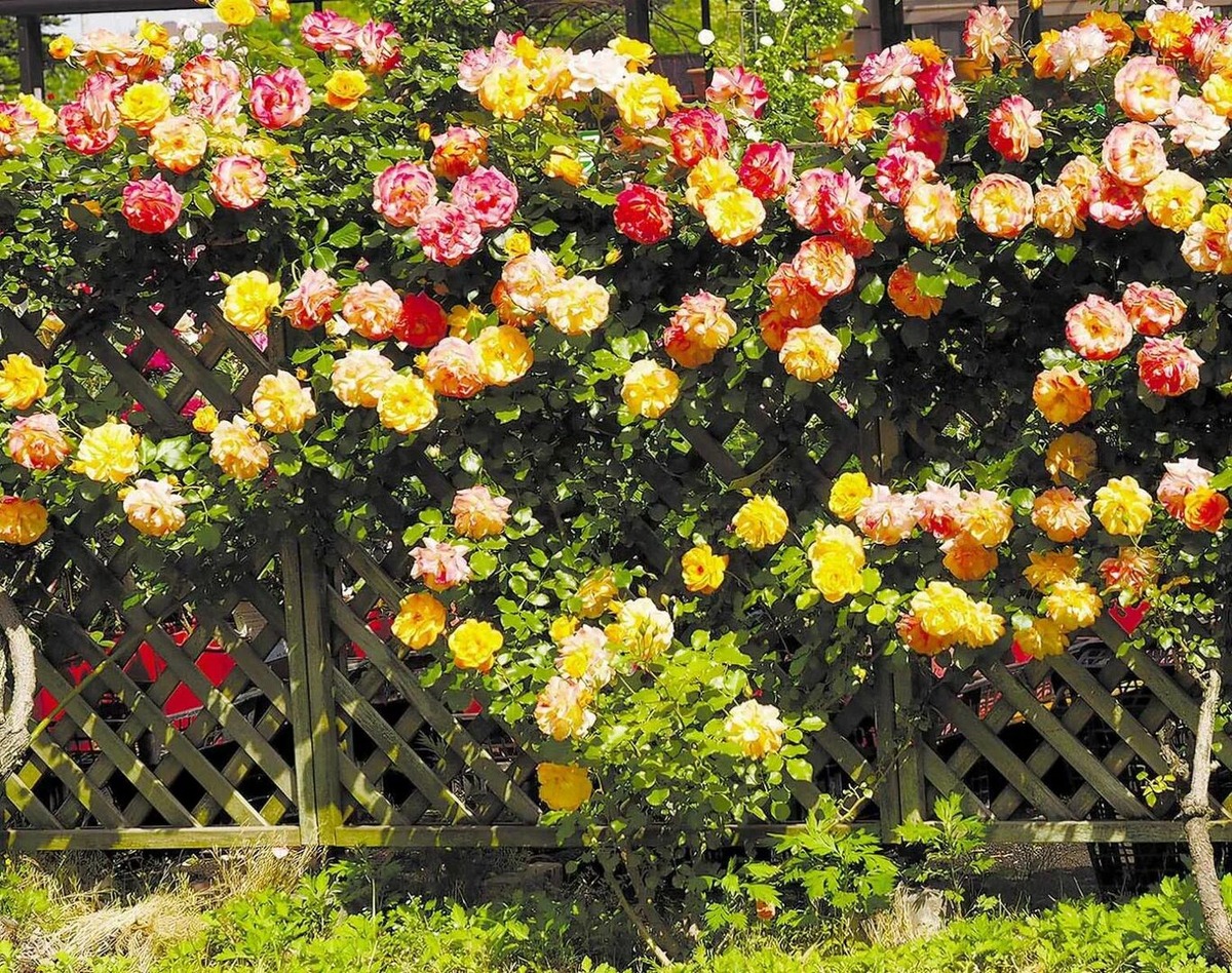 Посадив одну розу у забора, вы получите цветущую стену высотой 2-3 метра. Запах — как в парфюмерном магазине. Цветет раз в год (июнь), но так обильно, что не видно листьев.
