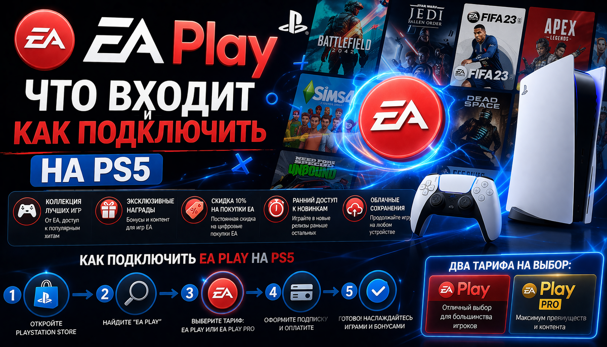 Кратко: EA Play — отдельная подписка на 80-100 игр Electronic Arts. FC 25, Battlefield, Mass Effect, Dead Space, Star Wars, Need for Speed. Цены — от 600₽/мес (Индия). Не входит в PS Plus — покупается отдельно. Что такое EA Play EA Play — подписка от Electronic Arts с доступом к библиотеке их игр. Работает на PS5, PS4, Xbox и ПК. Даёт три вещи: • Библиотека из 80-100 игр для скачивания • Скидка 10% на все покупки EA в PS Store (игры, DLC, внутриигровые покупки) • Ранний доступ к новинкам EA — 10 часов до покупки Какие игры есть Полный каталог обновляется, но вот основные на апрель 2026: Спорт: • EA Sports FC 25 (предыдущая часть, FC 26 появится позже) • Madden NFL 25 • NHL 25 • UFC 5 • PGA Tour Шутеры и экшен: • Battlefield 2042, Battlefield V, Battlefield 1 • Star Wars Battlefront II • Star Wars Jedi: Fallen Order • Star Wars Jedi: Survivor • Dead Space (ремейк) • Titanfall 2 Гонки: • Need for Speed Unbound • Need for Speed Heat • Burnout Paradise Remastered RPG и приключения: • Mass