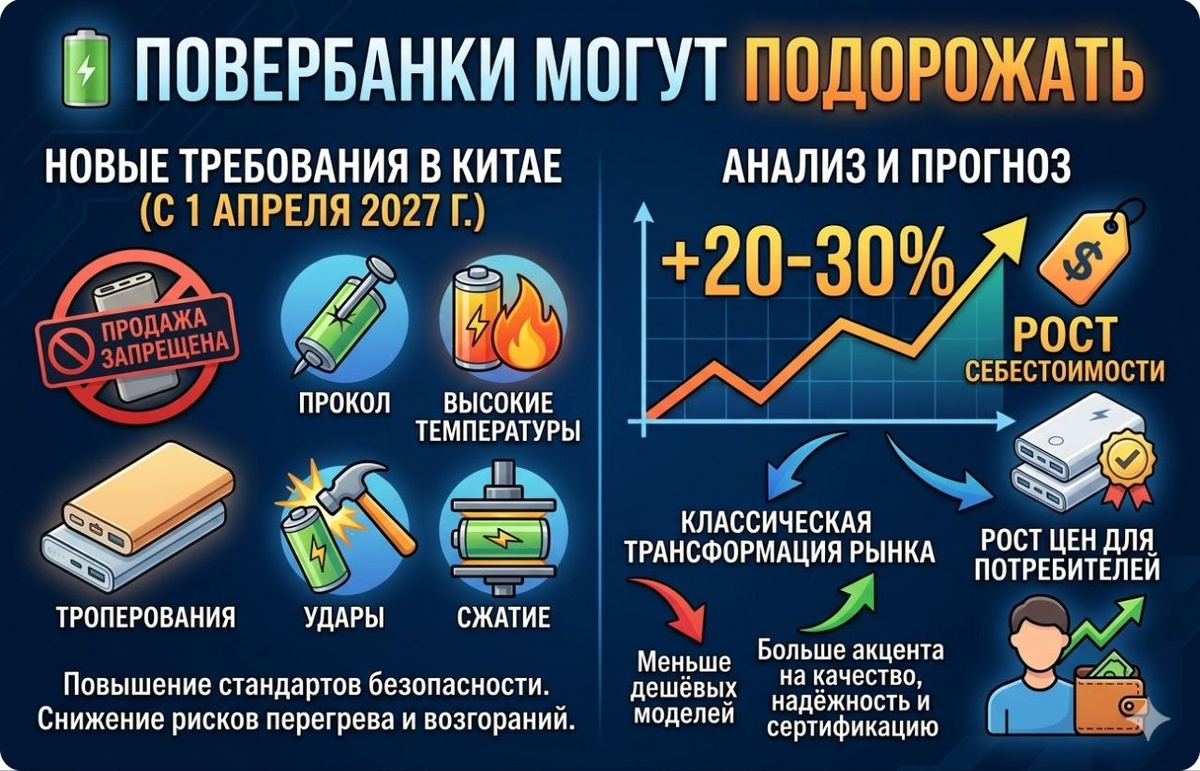 В Китае ужесточают требования к производству портативных аккумуляторов: с 1 апреля 2027 года запретят продажу устройств, не выдерживающих серьёзные испытания — от прокола и высоких температур до ударов и сжатия. Речь идёт о повышении стандартов безопасности после инцидентов с возгораниями. Аналитики уже прогнозируют рост себестоимости на 20–30%, что неизбежно отразится на ценах для потребителей. В итоге рынок ждёт трансформация: меньше дешёвых моделей — еще больше акцента на качество и сертификацию. 🤩 PRO: история продолжается