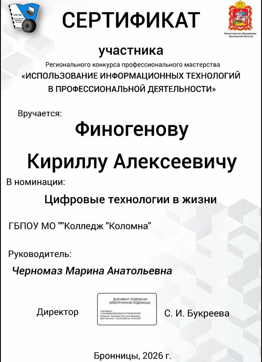 📅 2 апреля 2026 года на базе ГБПОУ МО «Автомобильно-дорожный колледж» состоялся Региональный конкурс профессионального мастерства «Использование инструментальных технологий в профессиональной деятельности». 🎯 Номинация: «Цифровые технологии в жизни» 👥 Участники от колледжа «Коломна»: ✨ Финогенов Кирилл ✨ Чернов Никита 📚 Специальность: «Техническая эксплуатация и обслуживание роботизированного производства (по отраслям)» 💡 Тема проекта: «Коботы — наши новые коллеги. Будущее, которое уже наступило» 🤝 Студенты достойно представили свою работу, показав, как современные технологии меняют производство, а главное — что завтрашний день робототехники начинается уже сегодня в стенах нашего колледжа. 🎉 Итог конкурса: ✅ Оба участника получили сертификаты участника – а это ценный опыт, новые знания и шаг к большим победам! #КолледжКоломна #Коботы #СПОмедиа