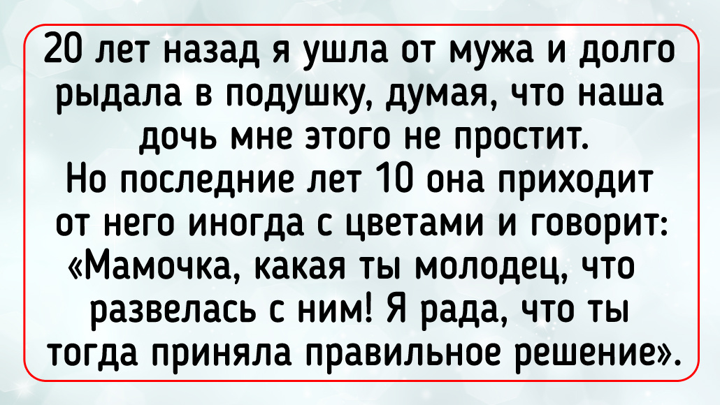20 лет назад я ушла от мужа и долго рыдала в подушку, думая, что наша дочь мне этого не простит. Но последние лет 10 она приходит от него иногда с цветами и говорит: «Мамочка, какая ты молодец, что развелась с ним! Я рада, что ты тогда приняла правильное решение».