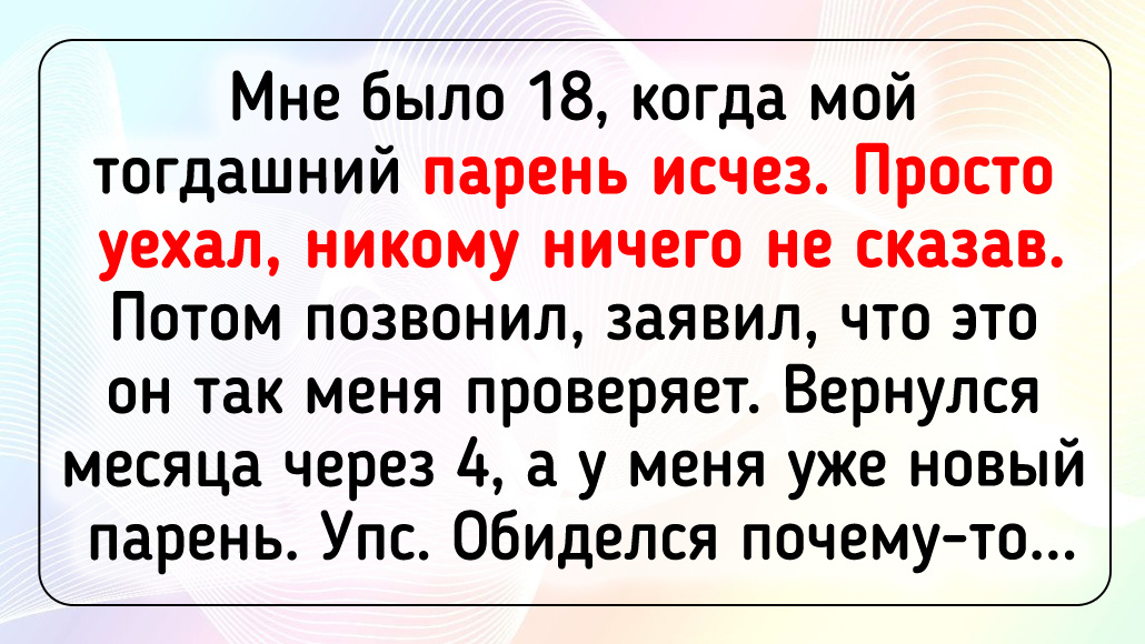 Мне было 18, когда мой тогдашний парень исчез. Просто уехал, никому ничего не сказав. Потом позвонил, заявил, что это он так меня проверяет. Вернулся месяца через 4, а у меня уже новый парень. Упс. Обиделся почему-то... © Тру-ру-ру / ADME