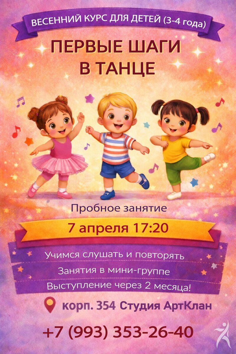 «Первые шаги в танце» (2 месяца) 📅 Старт с пробного занятия: 7 апреля (вт) 17:20–18:00 Мы помогаем ребенку научиться: ✨ слышать и выполнять задания педагога ✨ повторять движения за хореографом ✨ держать внимание дольше ✨ двигаться в ритме музыки ✨ становиться увереннее в группе 🎯 В конце курса открытое занятие + выступление для родителей Подходит, даже если ваш ребенок: стеснительный / быстро отвлекается / это первый опыт занятий ⚠️ Сейчас осталось 4 места! Запись в личные сообщения @artklan_admin или по телефону: +7 (993) 353-26-40