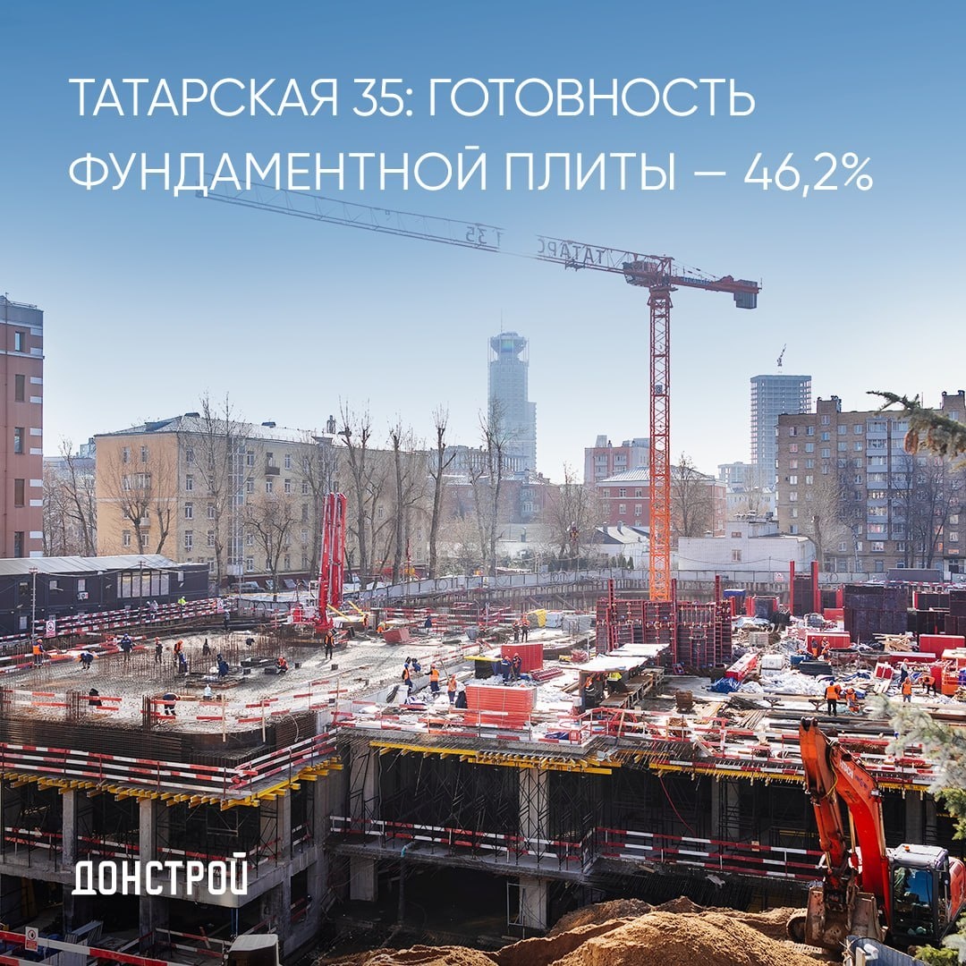 Ход строительства: жилой комплекс «Татарская 35» Девелопер «Донстрой» продолжает активные работы на строительной площадке своего нового проекта - жилого комплекса «Татарская 35»: ▫️продолжаются работы по монолиту — в 3-м корпусе вышли на уровень 1-го этажа; ▫️разработка грунта выполнена на 60,8%; ▫️шпунтовое ограждение котлована готово на 88,8%, распорная система — на 45%, гидроизоляция выполнена на 39,6%; ▫️бетонная подготовка — на 50,9%; ▫️фундаментная плита готова на 46,2%. Девелопер – «Донстрой» Архитектурная концепция – бюро «Apex» Адрес: улица Большая Татарская, вл. 35 (ЦАО) Via @Donstroymsk #ходстроительства 📱 Подписывайтесь на наш канал в Max