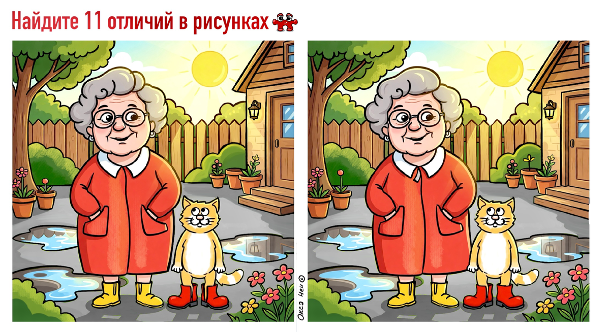 Теплый вечер после дождя - лучшее время для прогулки. Кеша с бабушкой вышли подышать свежим воздухом. Где-то на этих картинках мы с Кешей спрятали 11 отличий. Получится найти?