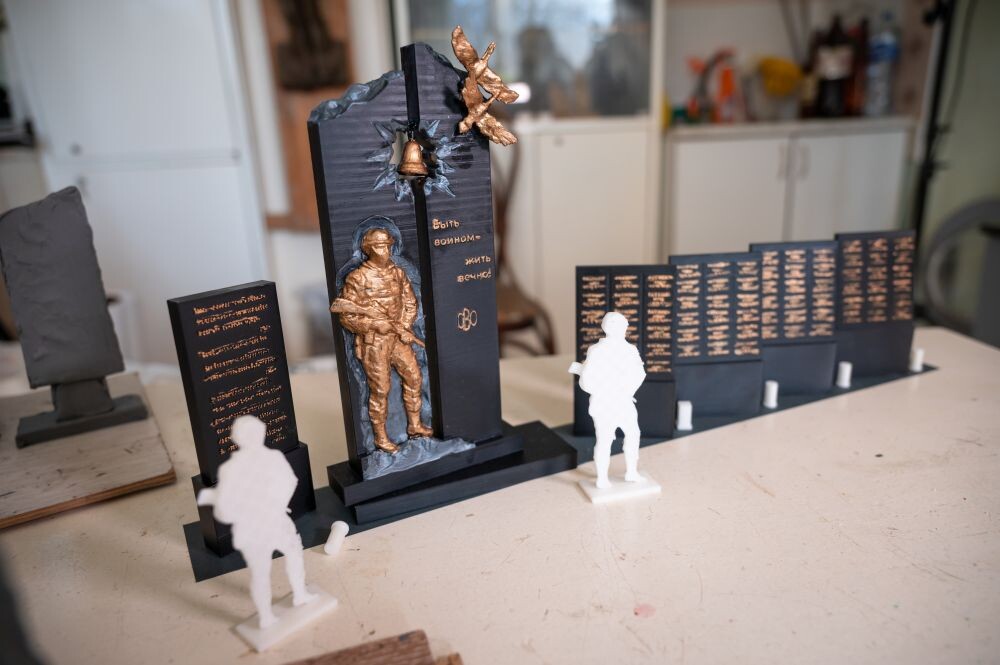 Макет будущего кенотафа уже утверждён. Сейчас скульптор вместе с сыном Сергеем занимаются изготовлением фигур журавлей, солдата и букв из глины.