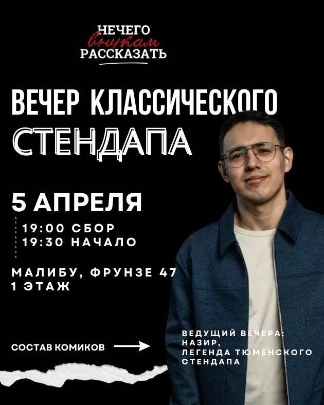 Юмористическое шоу классической стендап комедии с легендарными комиками. Смех, разрыв, истерика. Начало: 05 апреля 2026 19:00 Стоимость: 400.0 руб. Адрес: г Омск, ул Фрунзе, д 47 Организатор: https://vk.com/public173136515 5 АПРЕЛЯ | ВОСКРЕСЕНЬЕ 19:00 сбор гостей, 19:30 начало Стендап вечер"-это юмористическое шоу классической стендап комедии. Смех, Разрыв, Истерика. Состав комиков — ЛЕГЕНДАРНЫЙ 📍Малибу, первый этаж билеты: https://omsk.qtickets.events/226113-stendap-vecher #развлечения_stand_up Узнать подробности, адрес или записаться на событие.