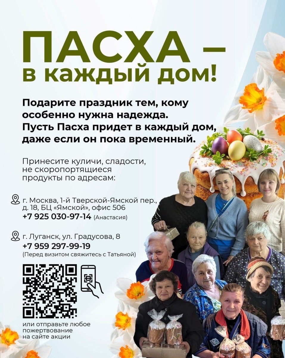 Акция «Пасха — в каждый дом» помогает 211 пожилым людям из дома престарелых в Антраците и 12 семьям с 27 детьми, которые остались без поддержки. Как помочь? 🔵онлайн — пожертвование по ссылке; 🔵оzon — заказать товары и отправить в ПВЗ (Балашиха), код прислать Анастасии: +7 925 030-97-14; 🔵лично — передать продукты в Москве или Луганске (ул. Градусова, 8; тел. +7 959 297-99-19). Можно приносить куличи, консервы, чай, сладости, сыр, колбаса, тёплые мелочи (тапочки, пледы, открытки). Давайте вместе подарим праздник тем, кто в нём так нуждается 🙏 Подписаться на Регион 181 | МАХ ⚡️