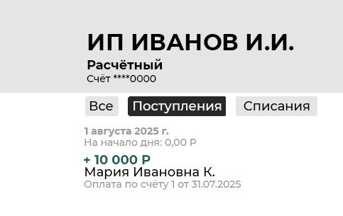 ❗Если ваш бизнес предполагает возможность получения средств на расчетный счет от физических лиц, важно своевременно отслеживать поступления на банковские счета, например, подключить банковскую услугу информирования о движении денежных средств по счетам.
